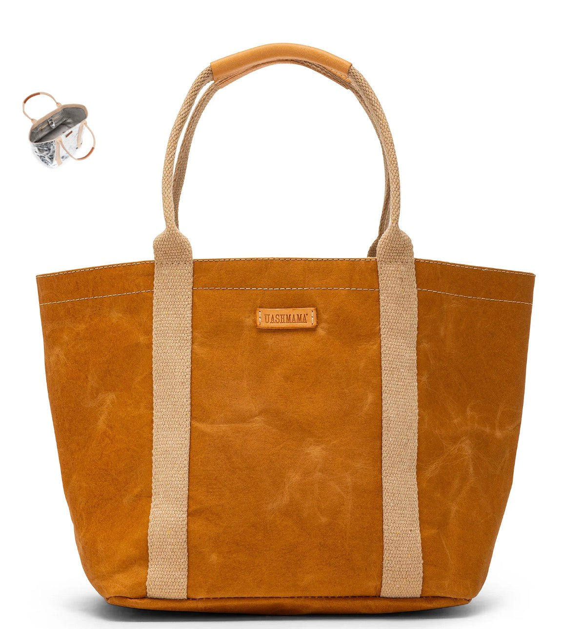 The shopper tote is a generously sized bag made from a combination of paper, cotton, and leather. This design has one internal zipped pocket and a magnetic closure.