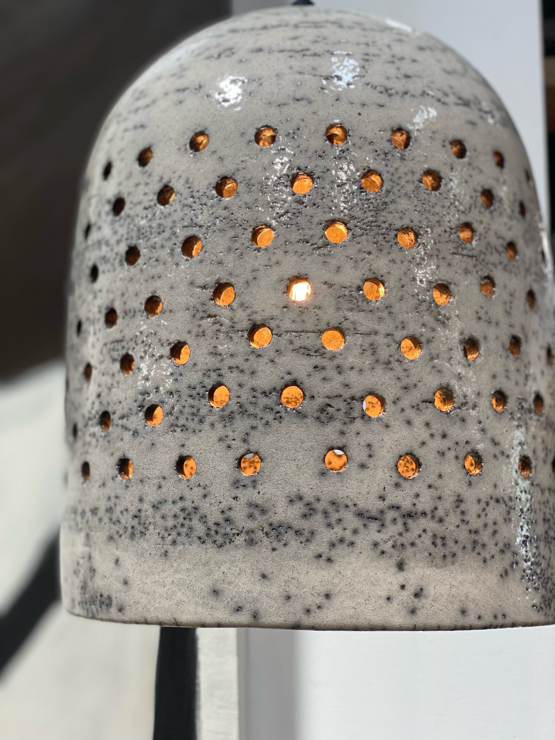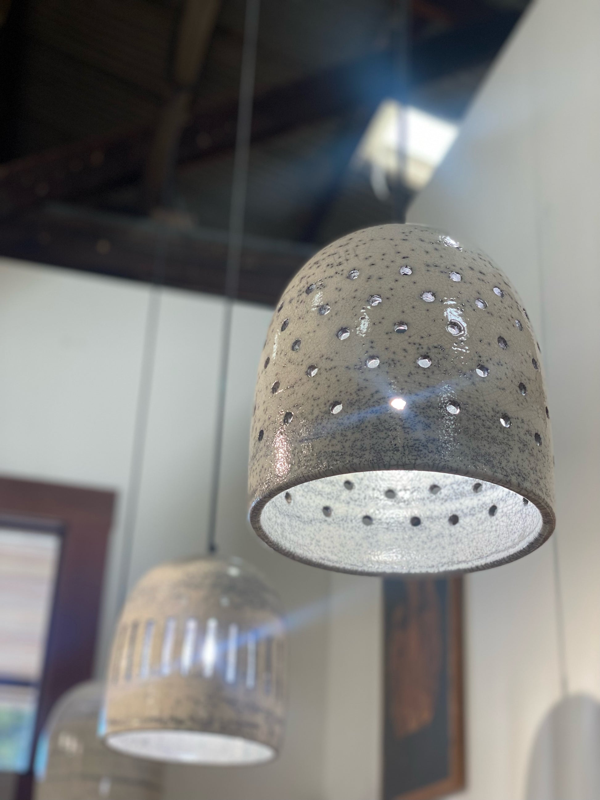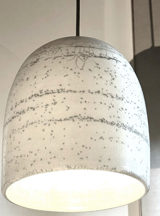 Hand crafted Raku fired pendants by local coastal ceramicist, C. Cherney. The circular and rectangular openings allow for subtle projection of ambient light...wonderfully tactile in white crackled glaze...each piece is hand made for you near the beach and with the care of a deeply committed ceramicist. Collect these rare pieces for your island or bathroom-or special niche...Custom order-2 months time frame plus shipping.