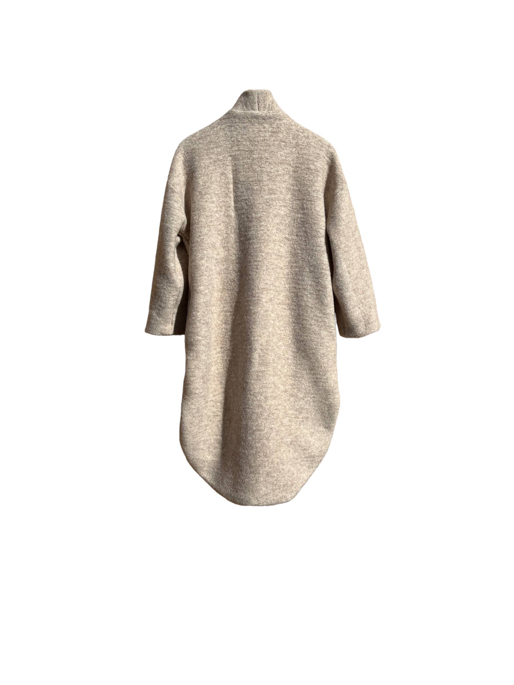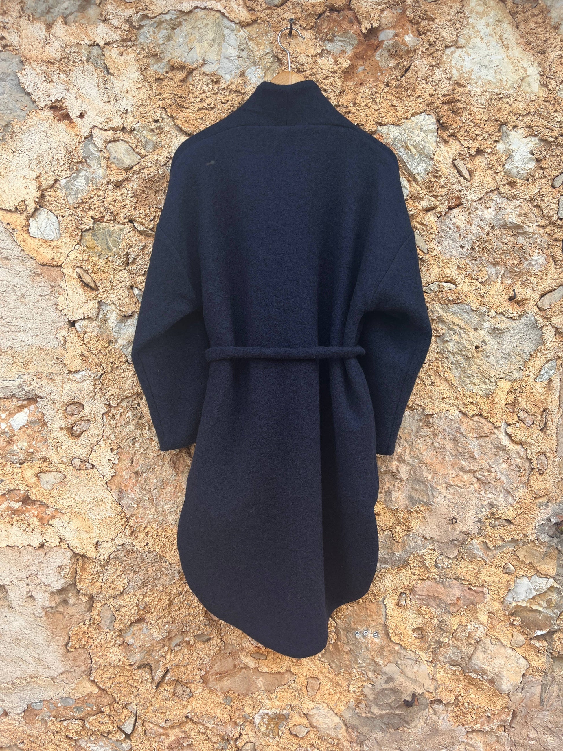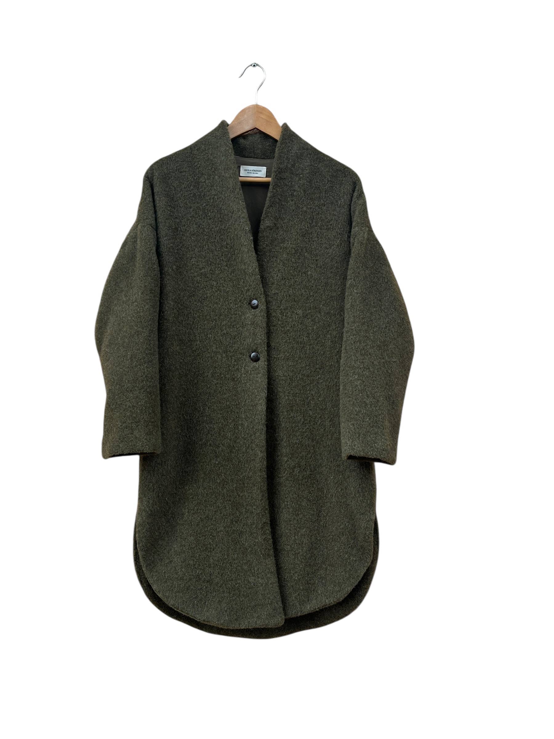 Wrap yourself in sustainable luxury with the Cigala Coat, an effortlessly elegant piece designed for both comfort and style. This knee-length coat features a slightly oversized, relaxed fit with dropped shoulders and a chic stand-up collar, making it a versatile addition to any wardrobe. The oval-shaped hem and wooden button closure add unique touches of sophistication, while the included belt offers styling flexibility. Thoughtfully designed with practical side pockets and fully lined for added comfort.
