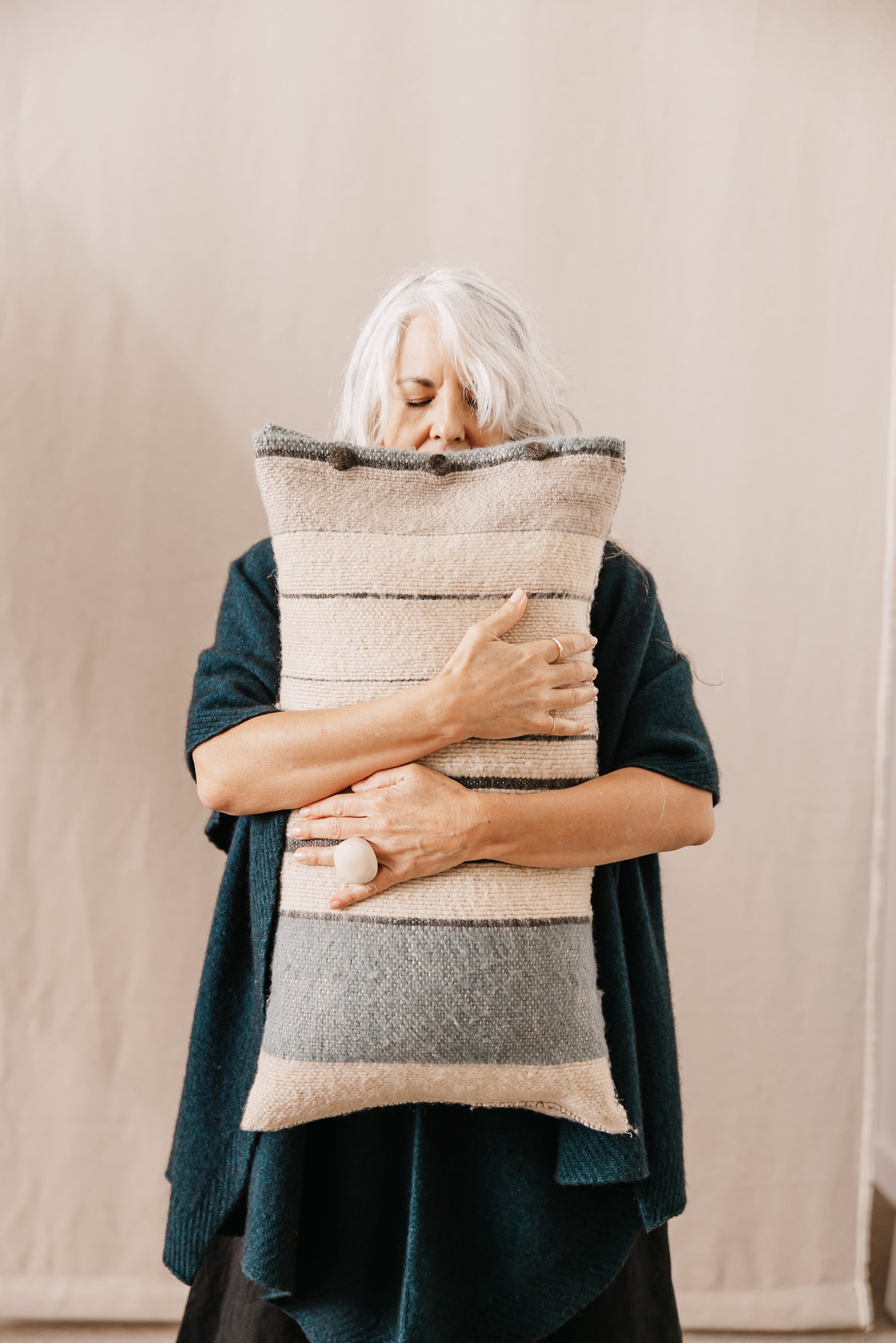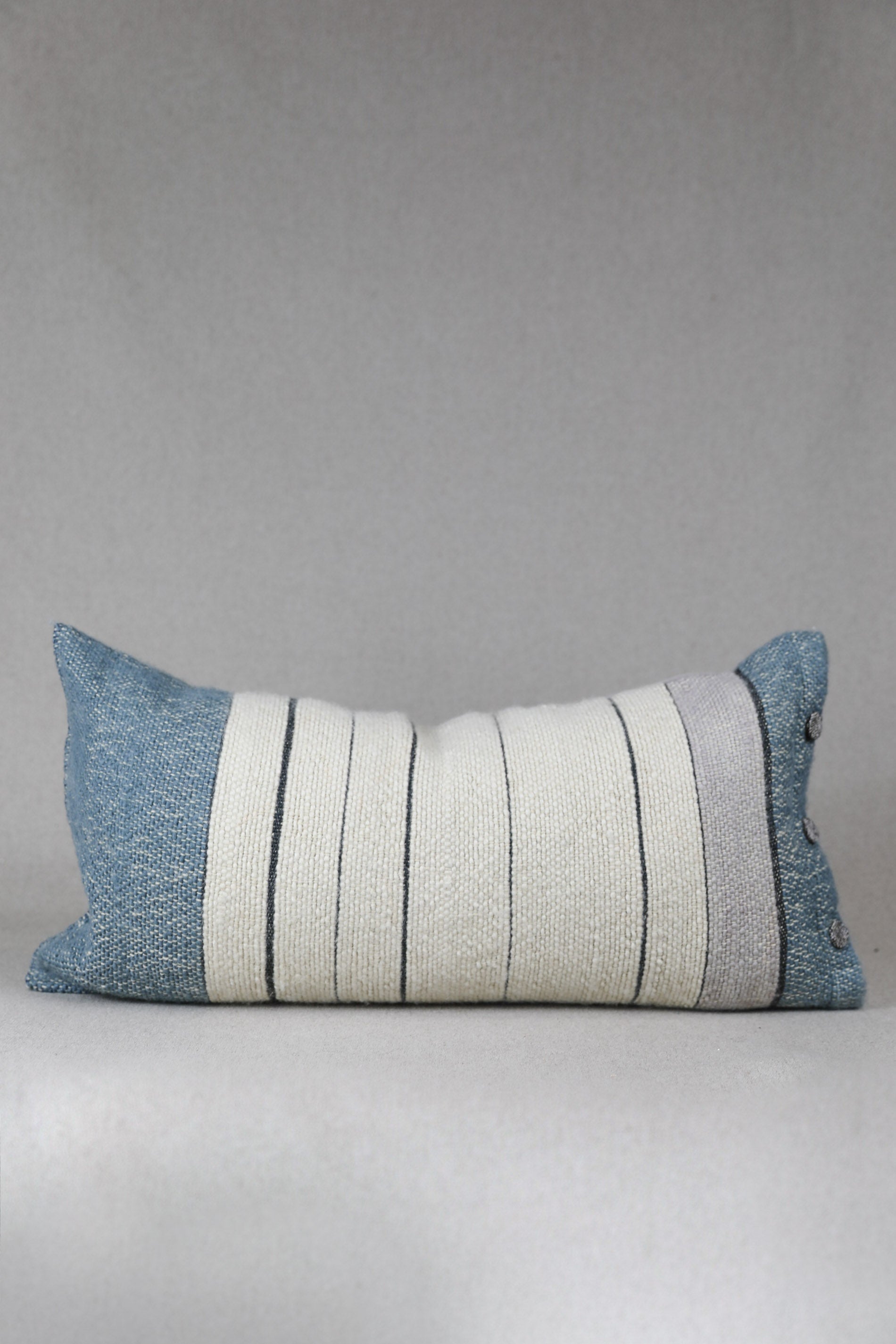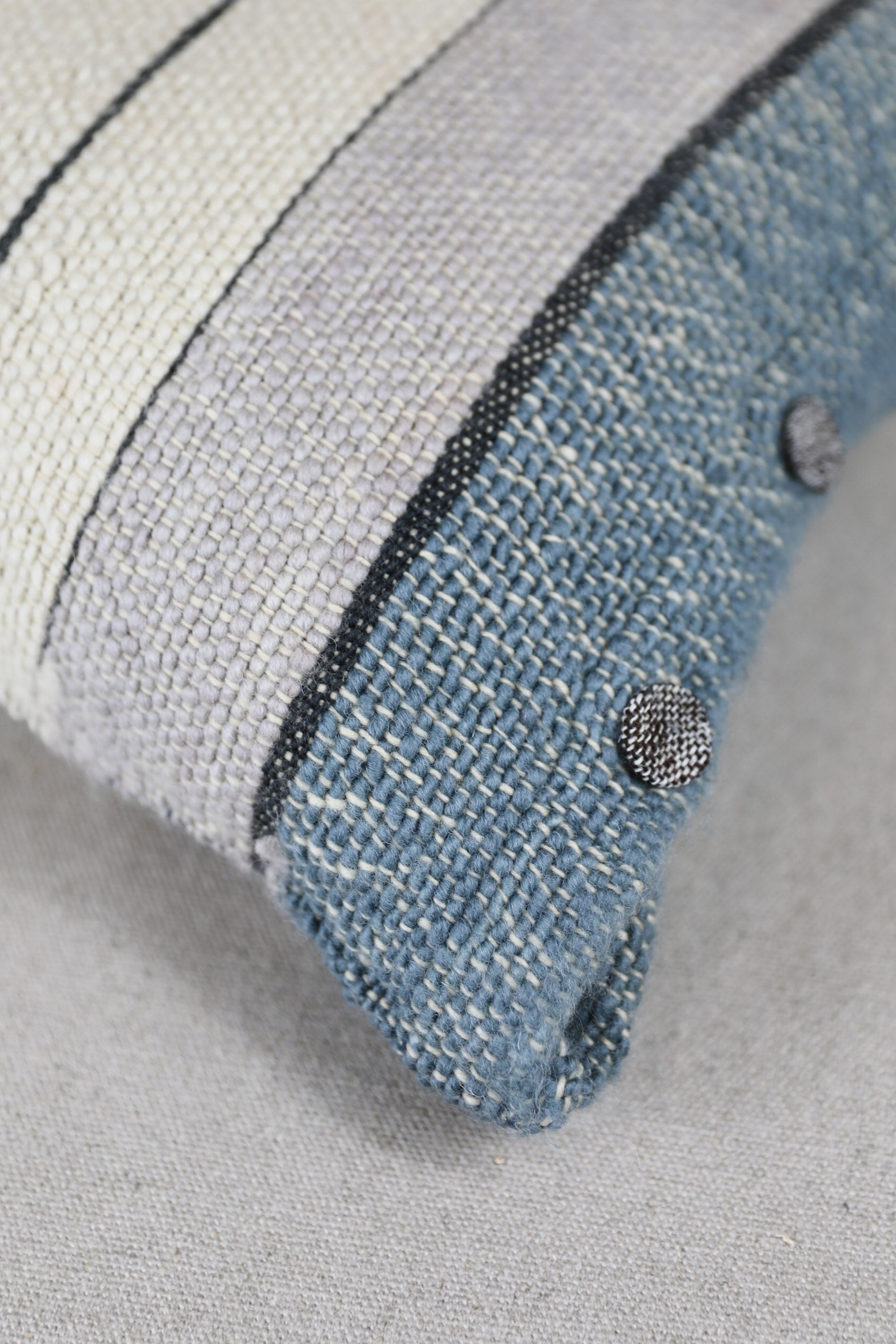 Handcrafted in 100% pure Indian Merino cushion in teal aqua and striking stripes. Handspun and handwoven in the distant Himalayan region. Hand dyed and hand brushed by the local artisans. This unique cushion has a soft handfeel with a tactile appeal. Made with a brass zipper for closure.
