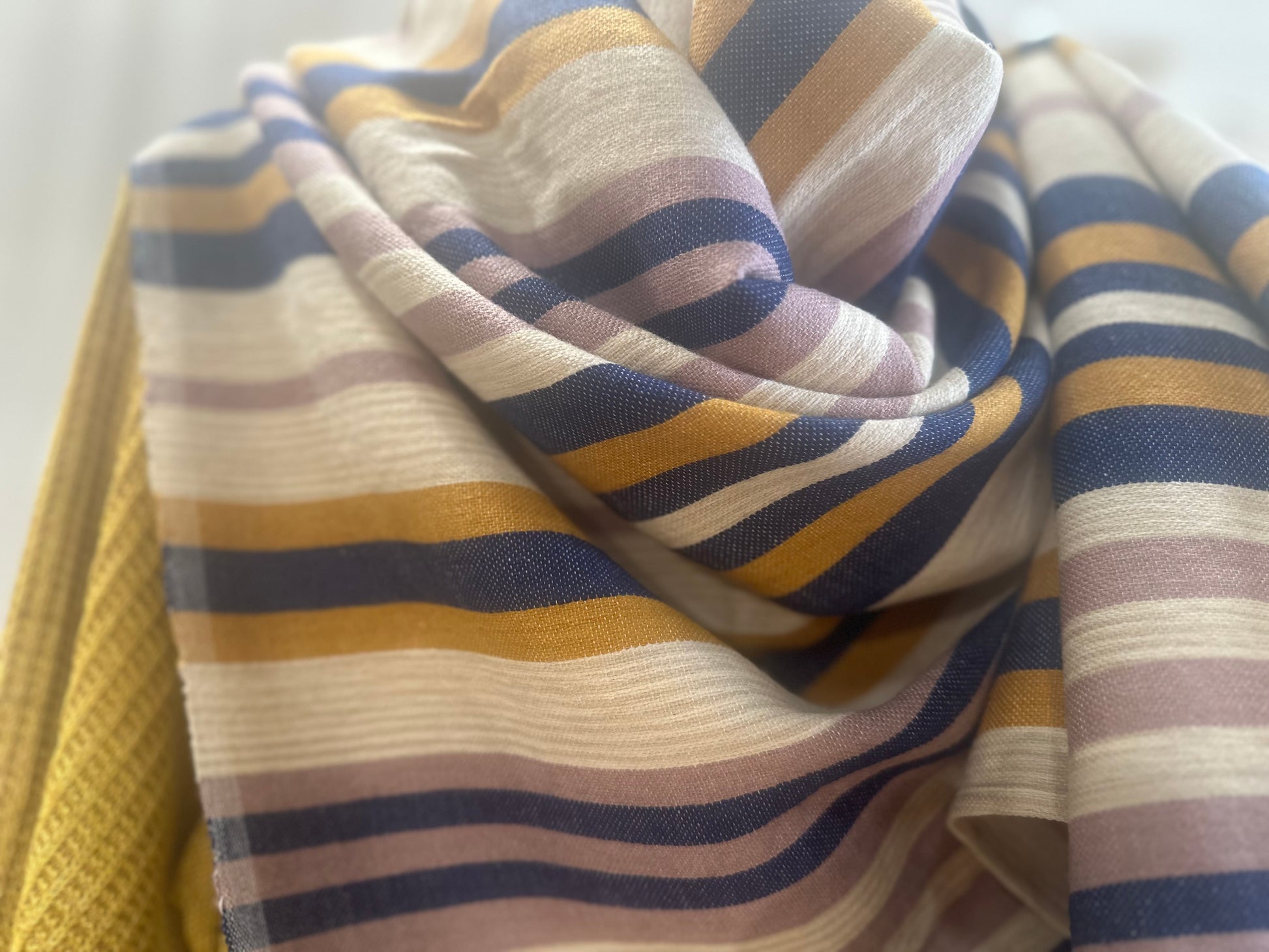 Our Khadi desert scarves are hand-spun, hand-woven cloths from India through fair trade co-ops, composed of a 90% wool weft and 10% cotton warp. Wool and cotton are first spun into yarn on a charkha, a spinning wheel, and then hand-dyed exclusively for Garza Marfa. The yarn is then woven on a handloom to produce our scarves designed by us in Marfa, Texas.