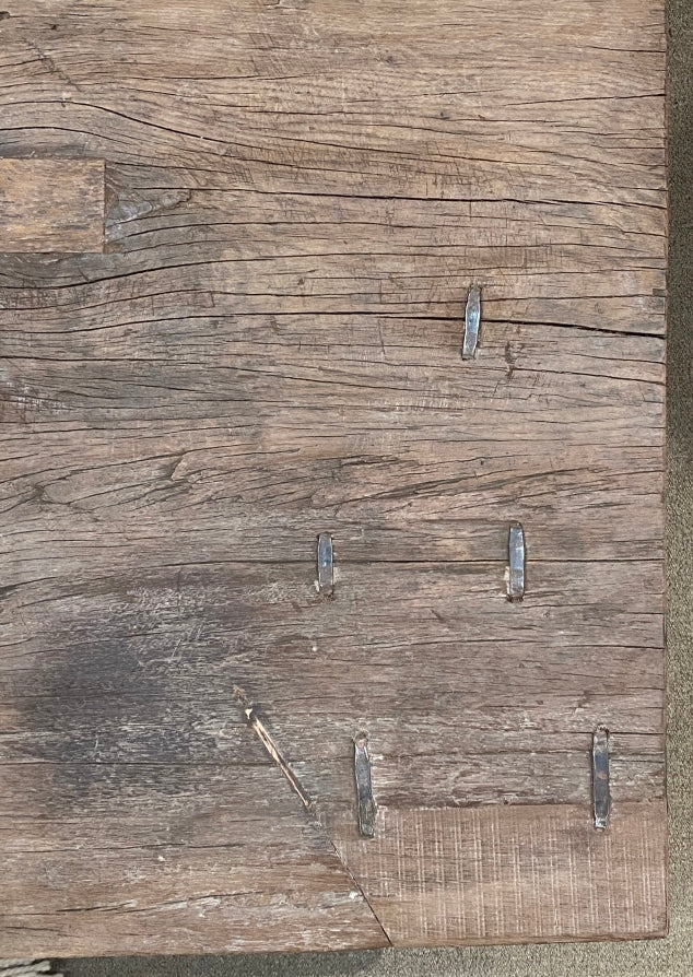 Vintage Indonesian Elm Door made into a slab and metal cocktail table. Hand forged hammered iron legs accent the weathered surface. Beautiful time honored markings and character. Sturdy and rustic.