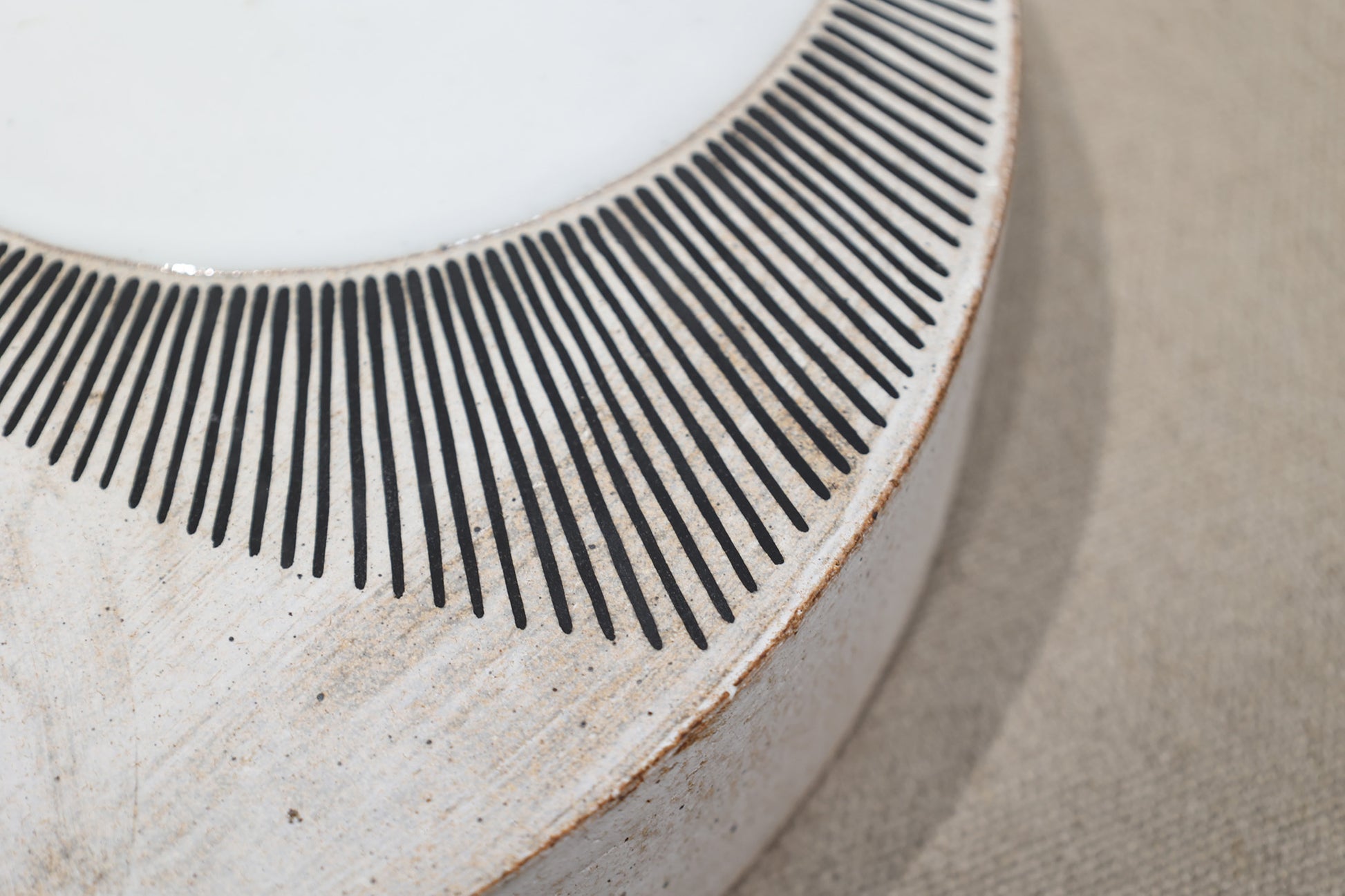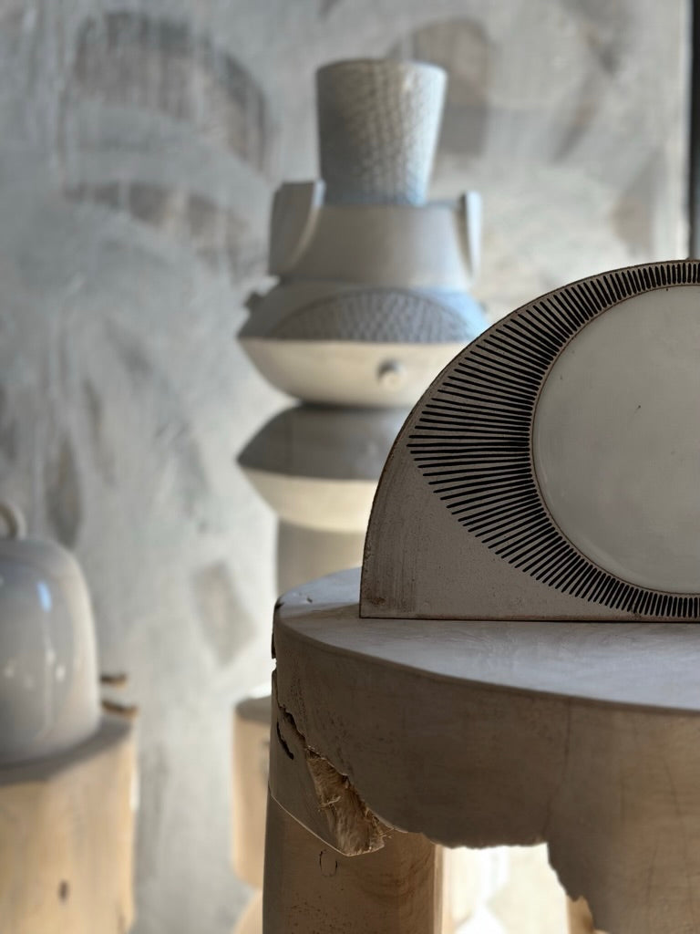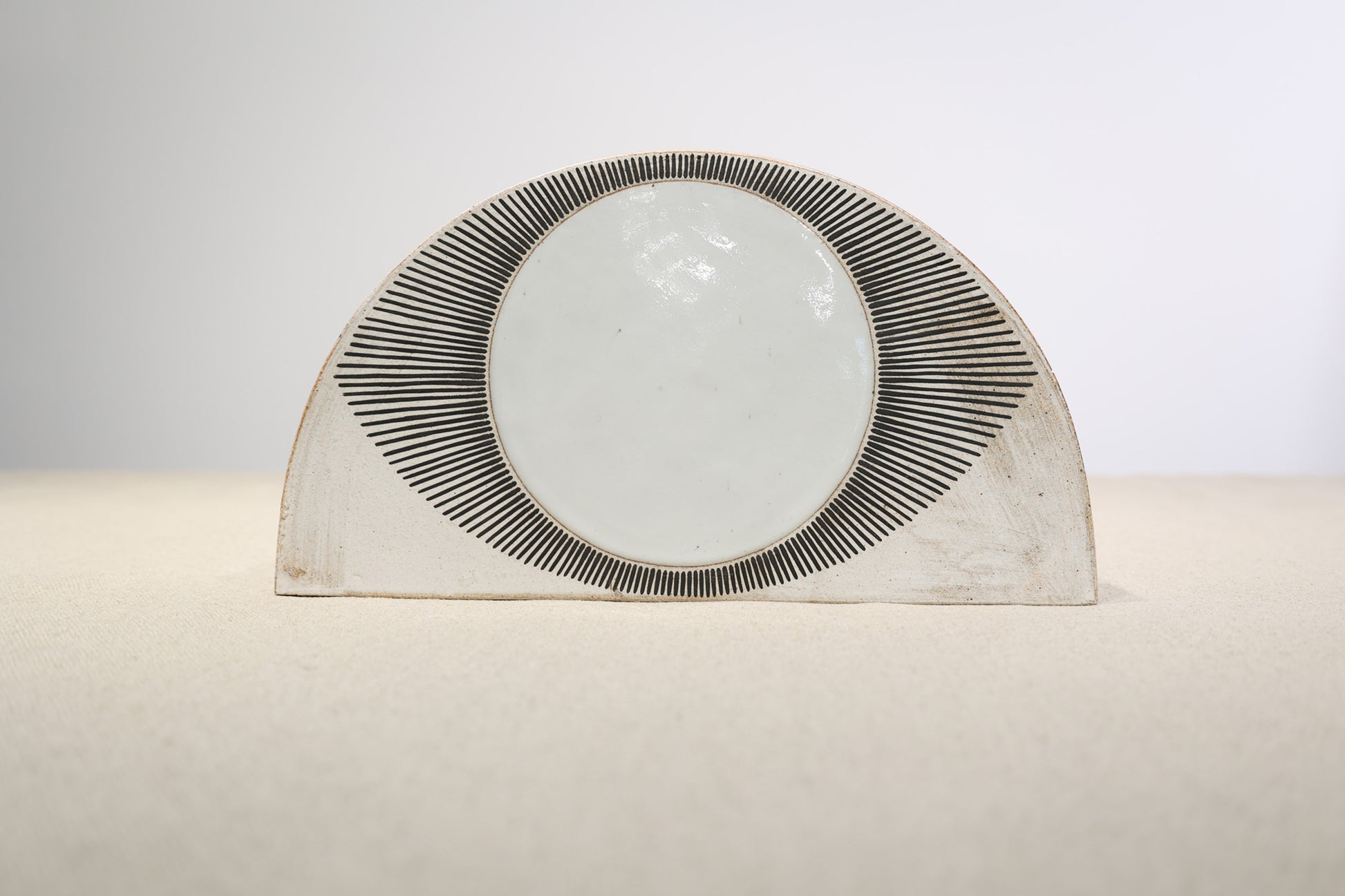 An Iconic Demi Lune Eye Stoneware Sculpture by MQuan. White gloss glaze..hand painted striations. Collect this one.