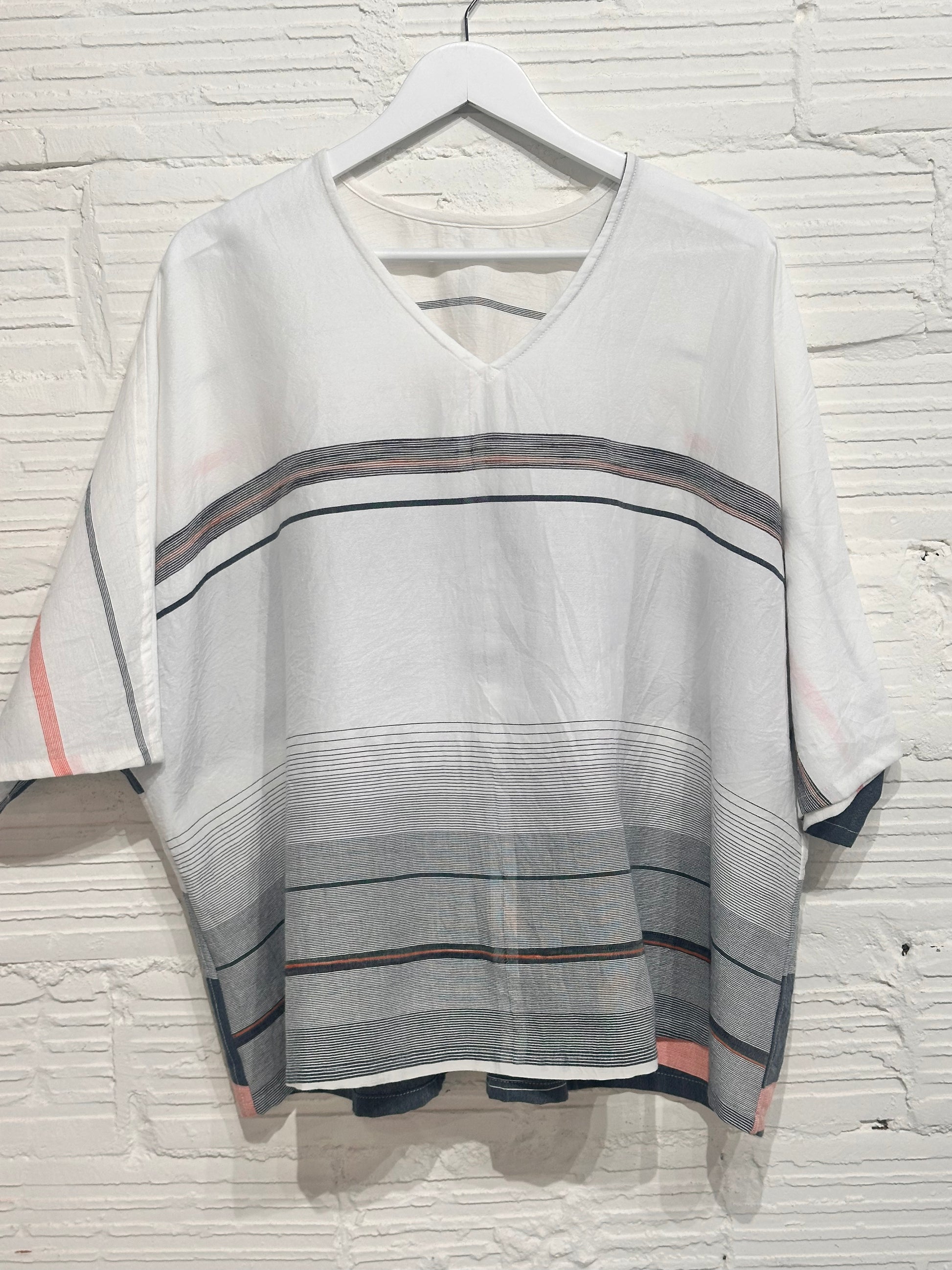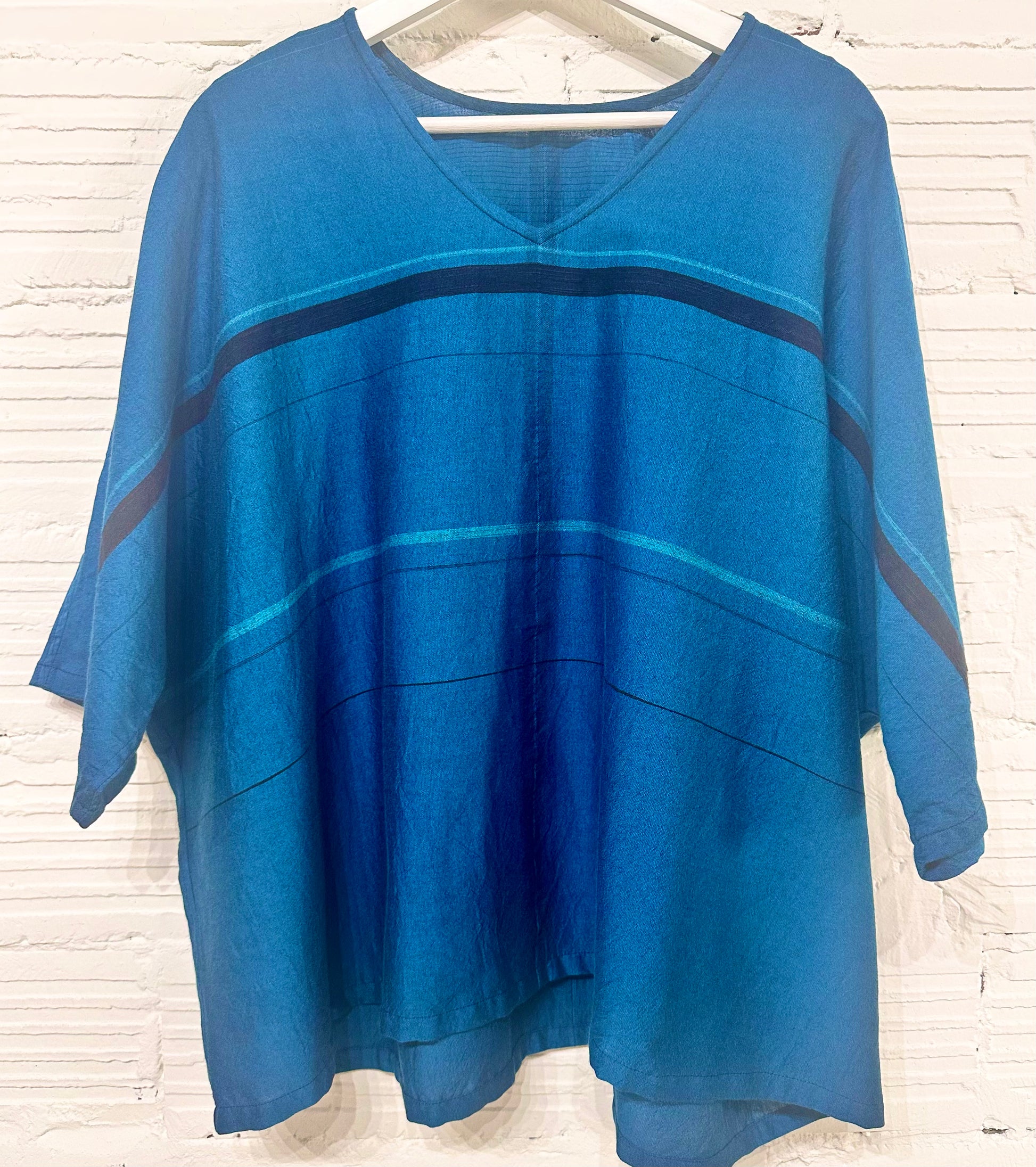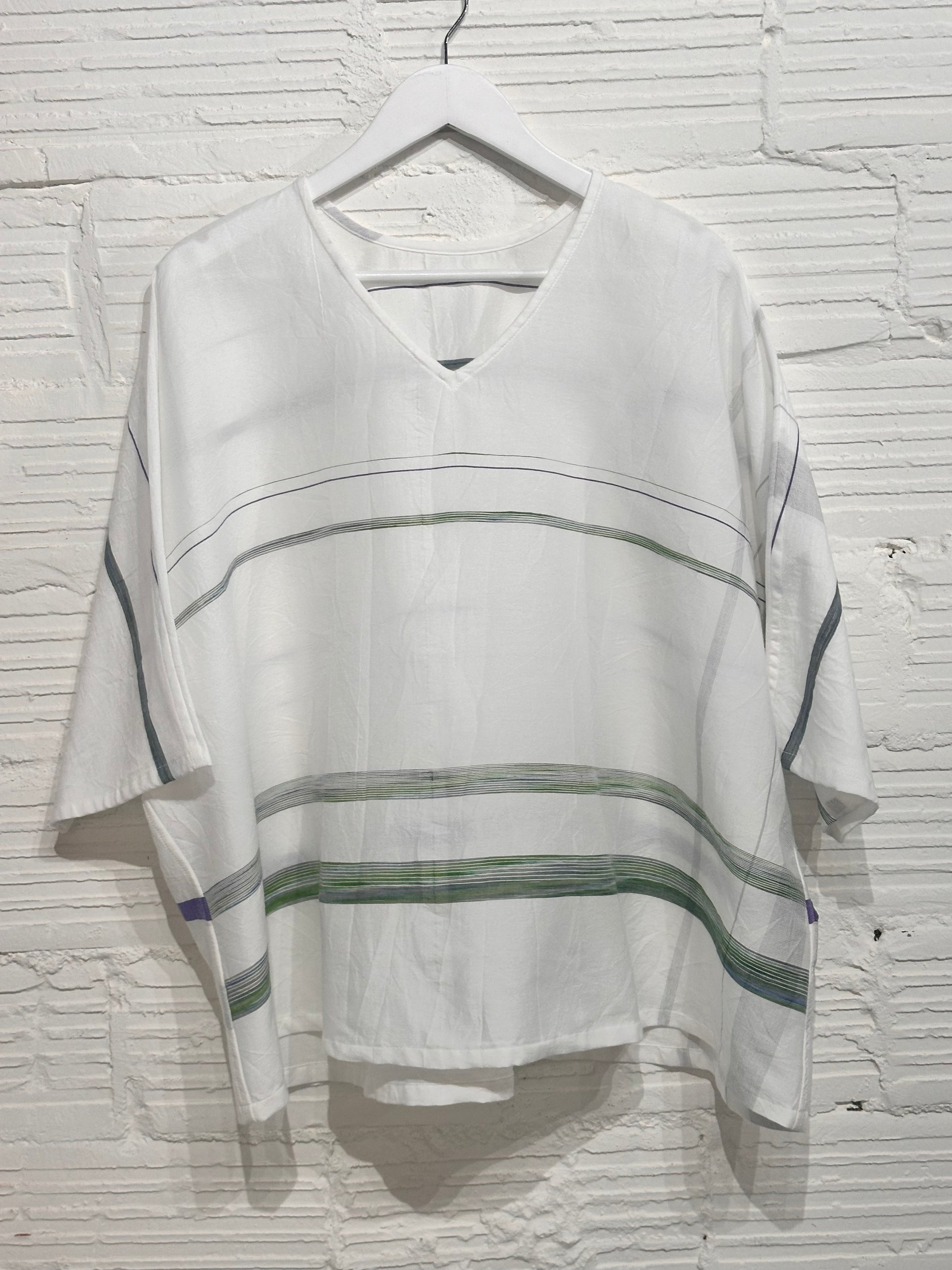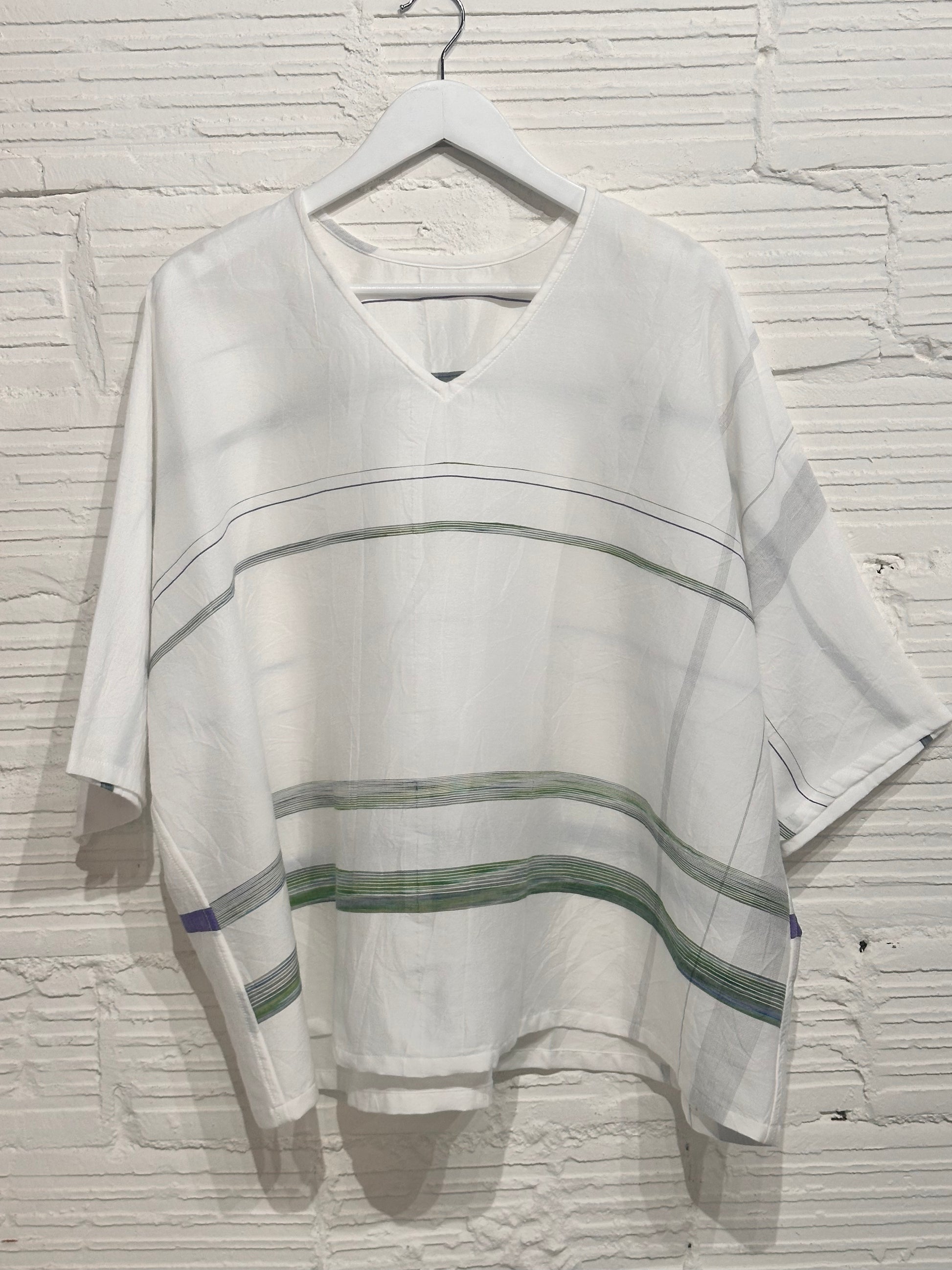 A light airy Organic Cotton top from Hyogo, Japan. One size fits most. Gender Fluid and just floats on any frame. Ease of flow...bit boxy but so light-no tuck needed...You will fall in love. Front and back differ to add interest. Every piece is a bespoke creation. Feather light feelings. It wants you to take it on a balmy travel.