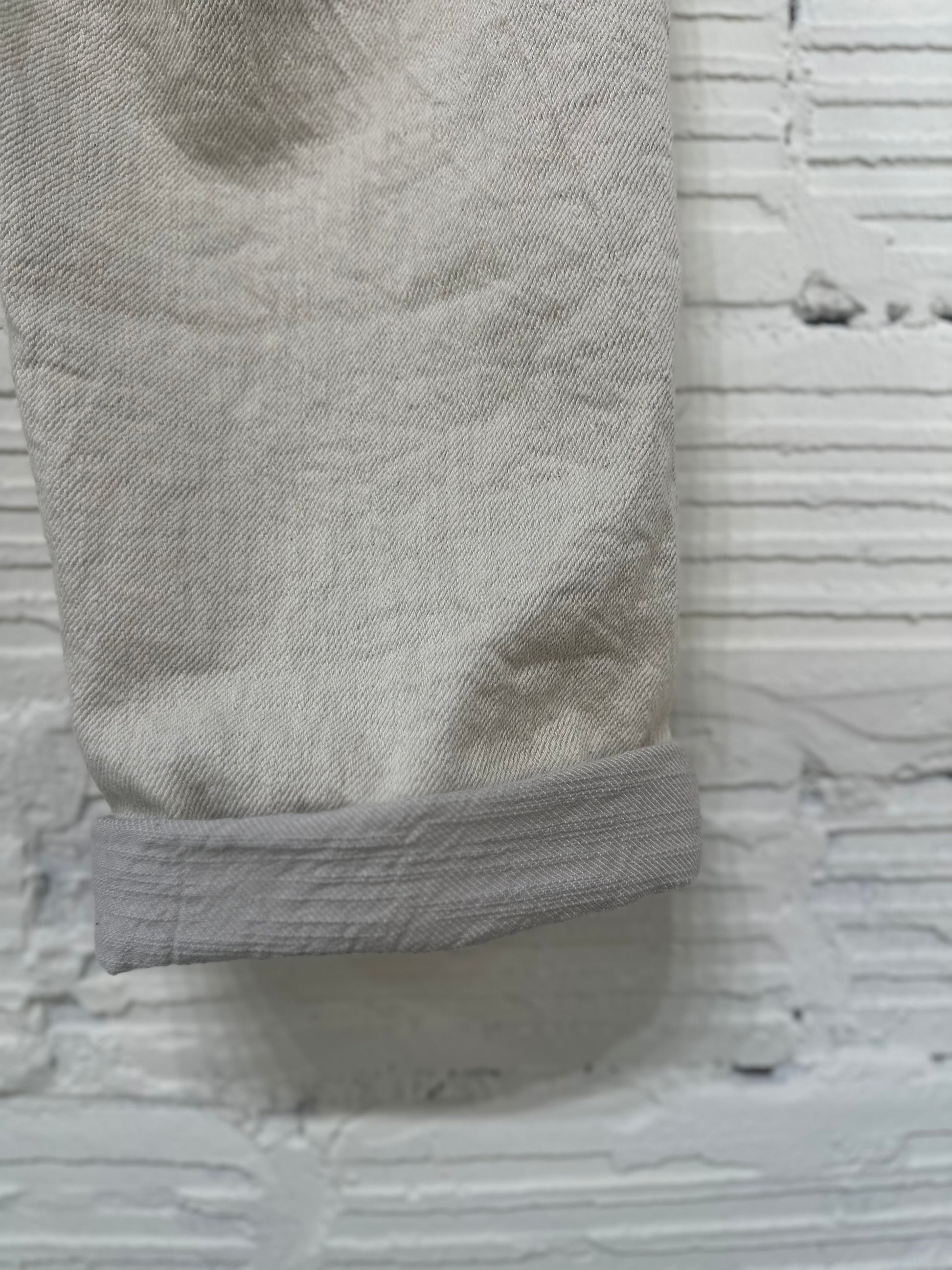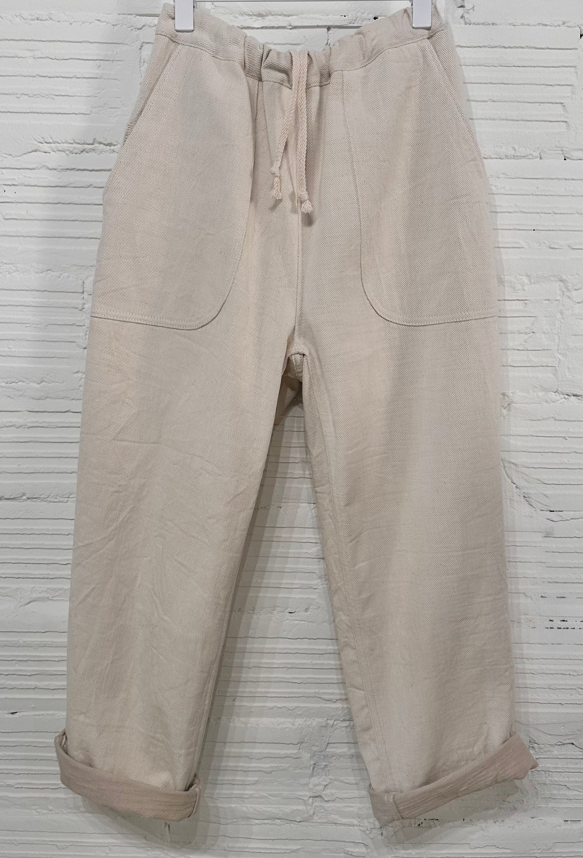 Casual Drawstring paper bag waist...Large rounded pockets...Soft and sturdy twill denim. So fly...so much to love. Share and groove on these.