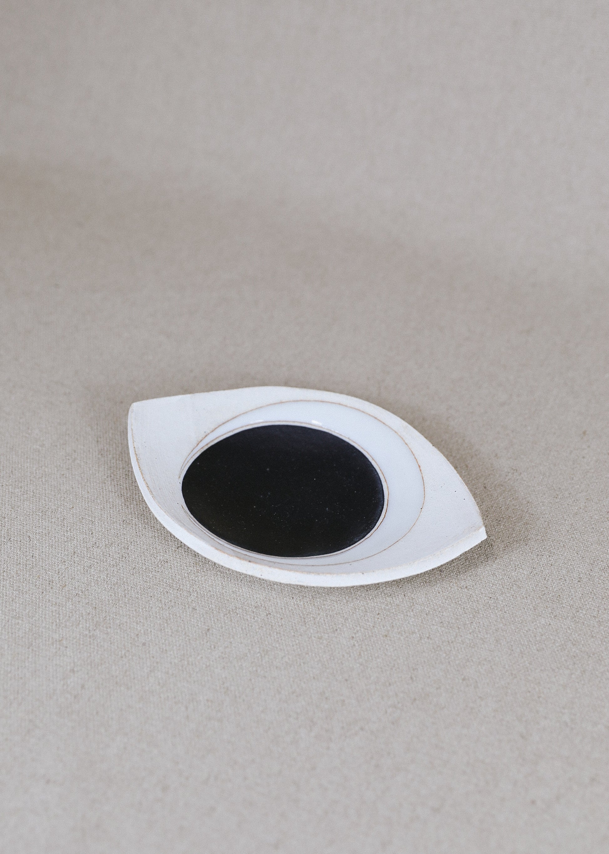 Hand built stoneware eye dish is painted with Crescent Indigo.