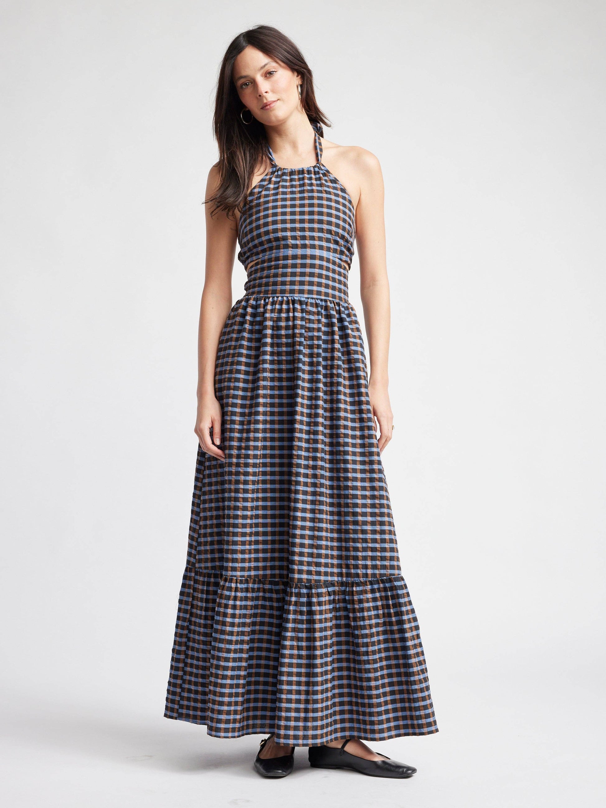 Self Contrast - Isolde Maxi Cut Out Dress: Blue Brown Checkers / M