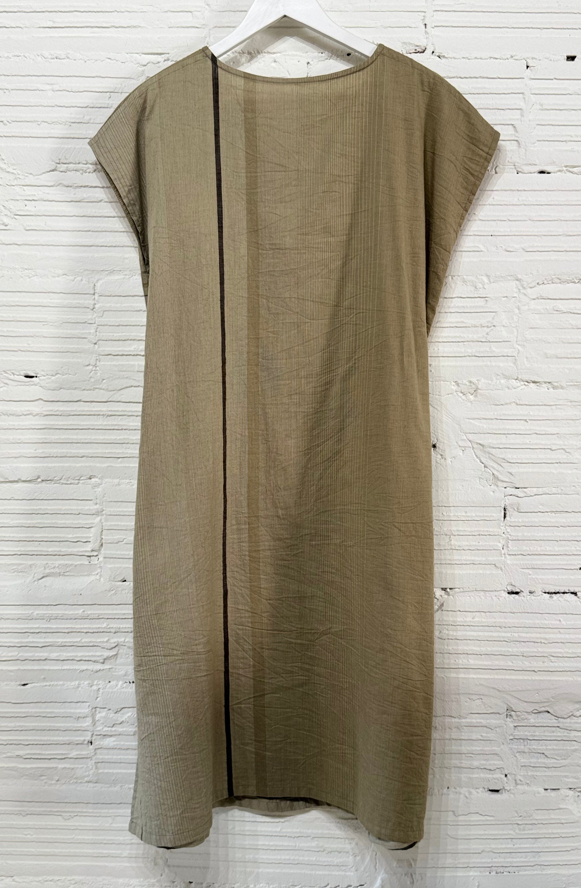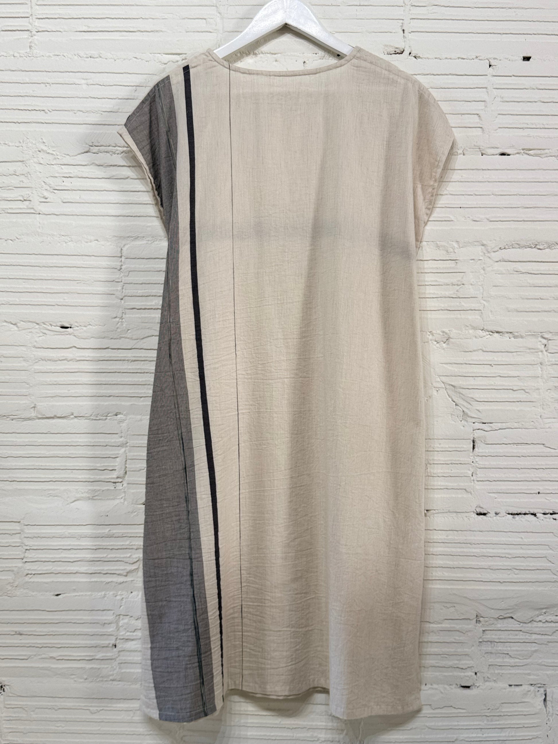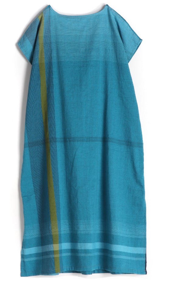One size fits-hangs straight with slight cap sleeve...airy and light as a feather. great for travel and layering. little side slices at hip..just right. hand made in Japan by Tamaki Niime.