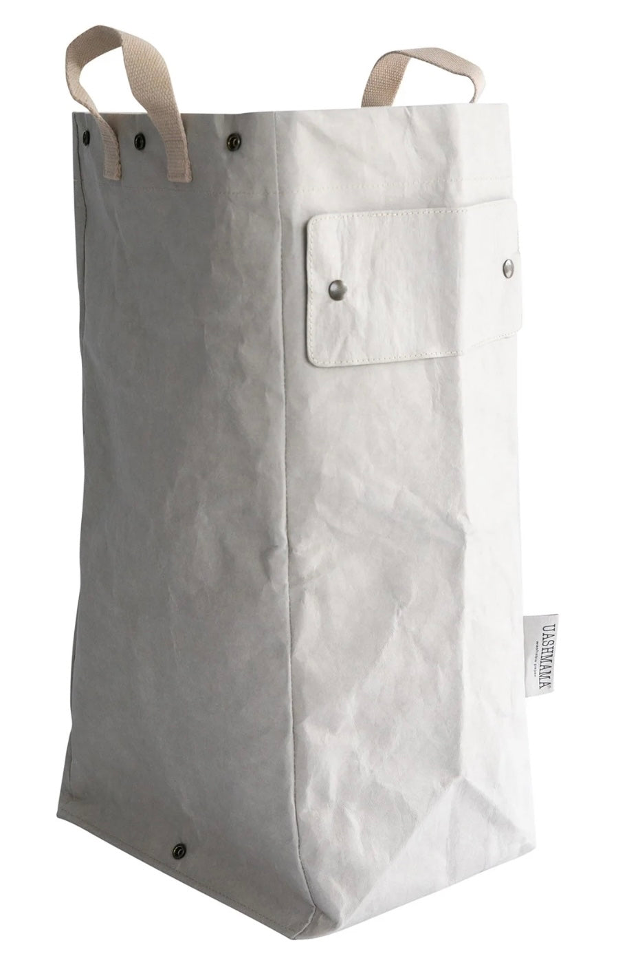 The Laundry Bag of your dreams that's lightweight, easy to carry and a stylish accessory to any room. A perfect alternative to a laundry basket. These upcycled, waterproof bags are sustainably made out of our washable paper and accommodate ample bundles of clothing and linens. Snap two together for easy sorting! These spacious and sturdy totes are also very useful in pantry and bathroom.