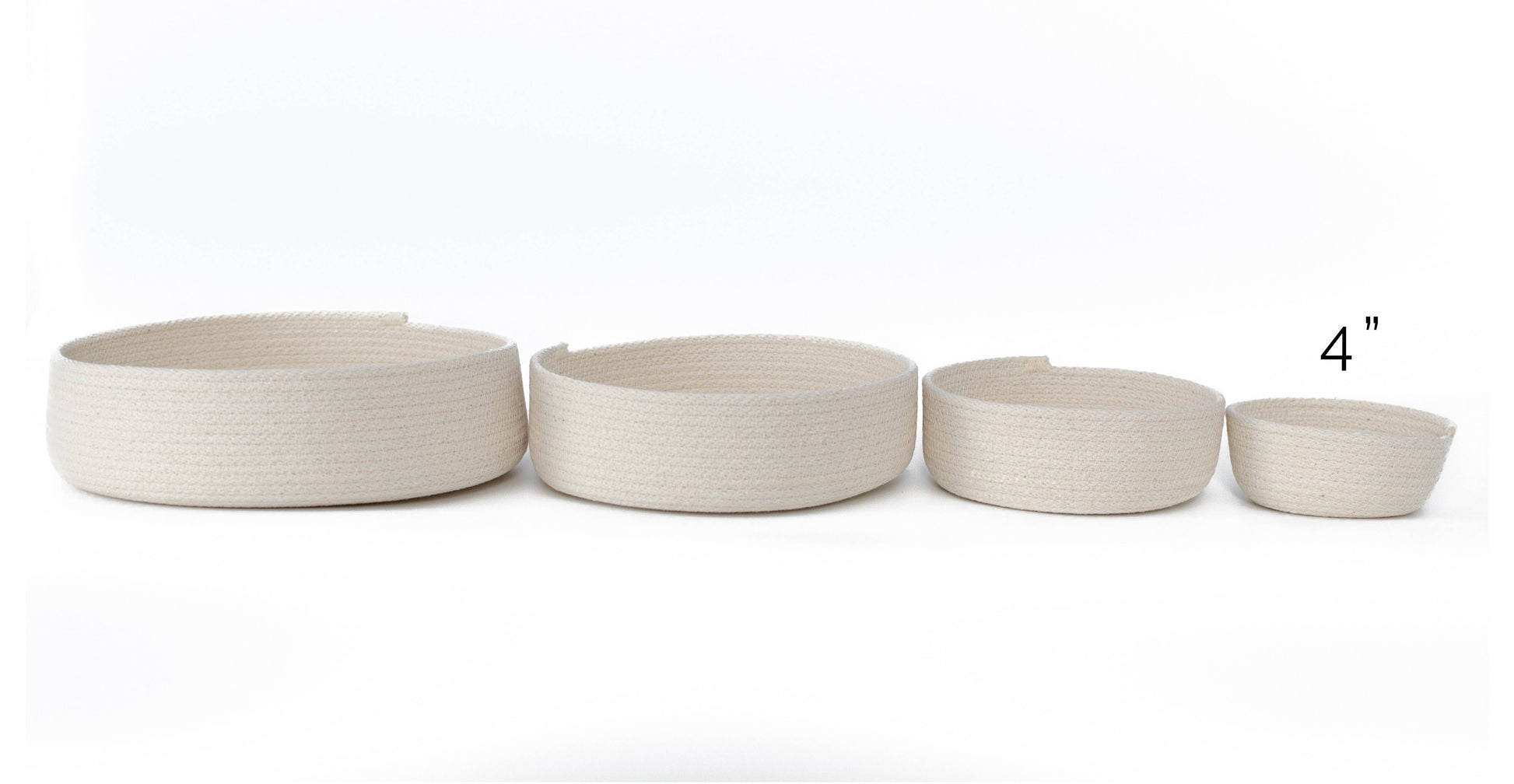 4” base, 1.5” tall The smallest basket in the bunch is the perfect size to catch all of the small random things you may have on your end tables, dressers, and bathroom. Keys, change, jewelry, you name it and this little guy will keep it safe. Available in 18 solid thread colors. This basket is made to order.