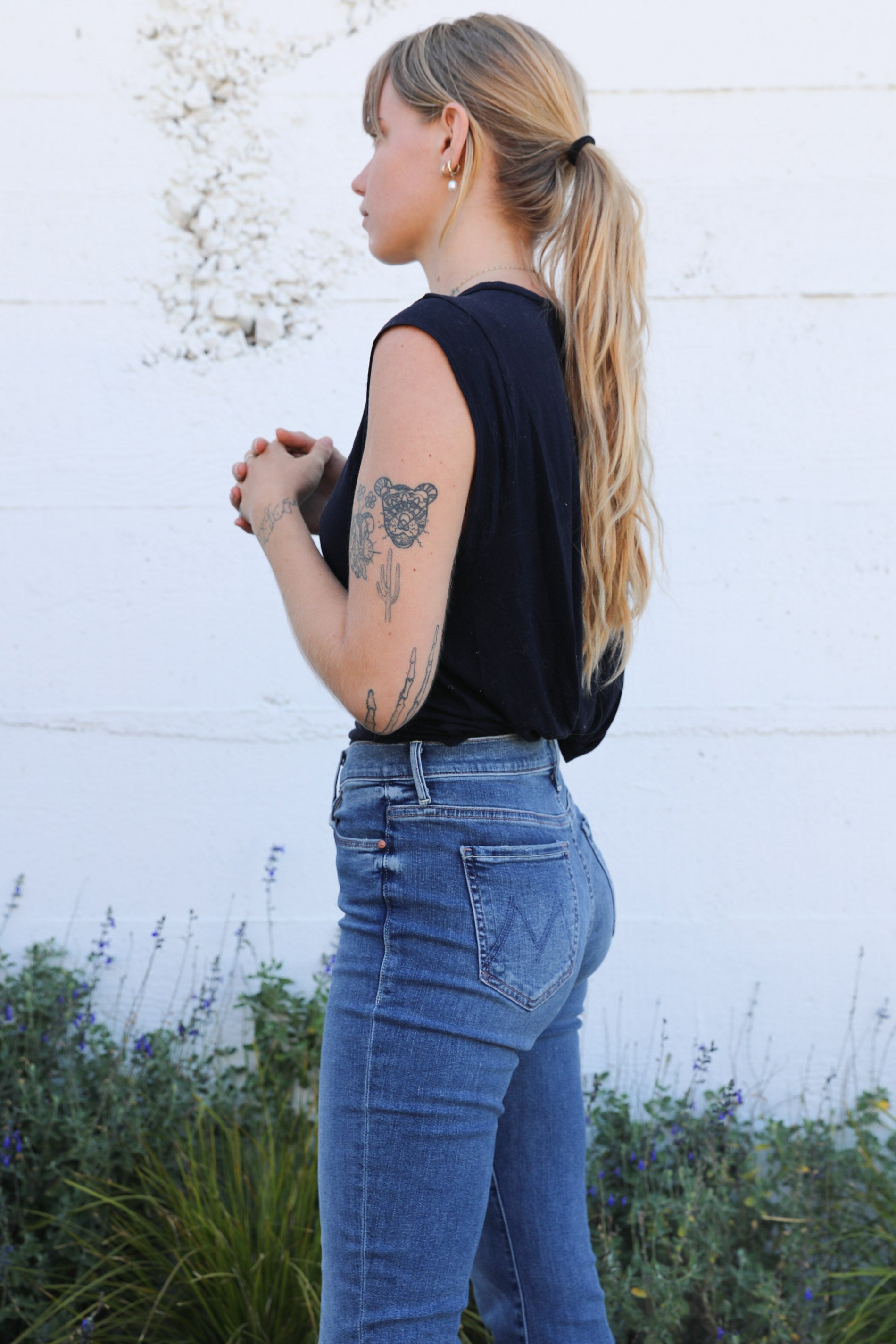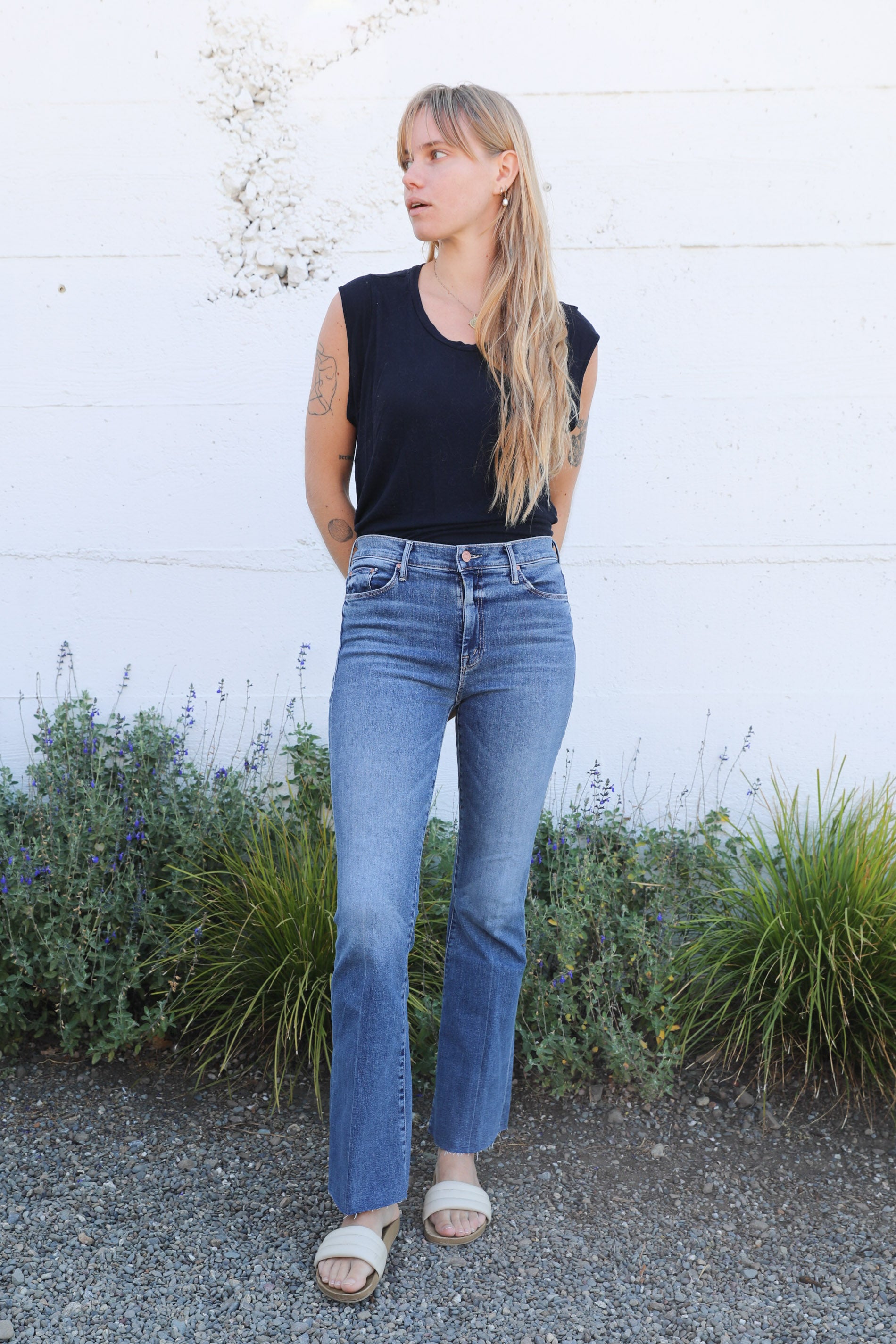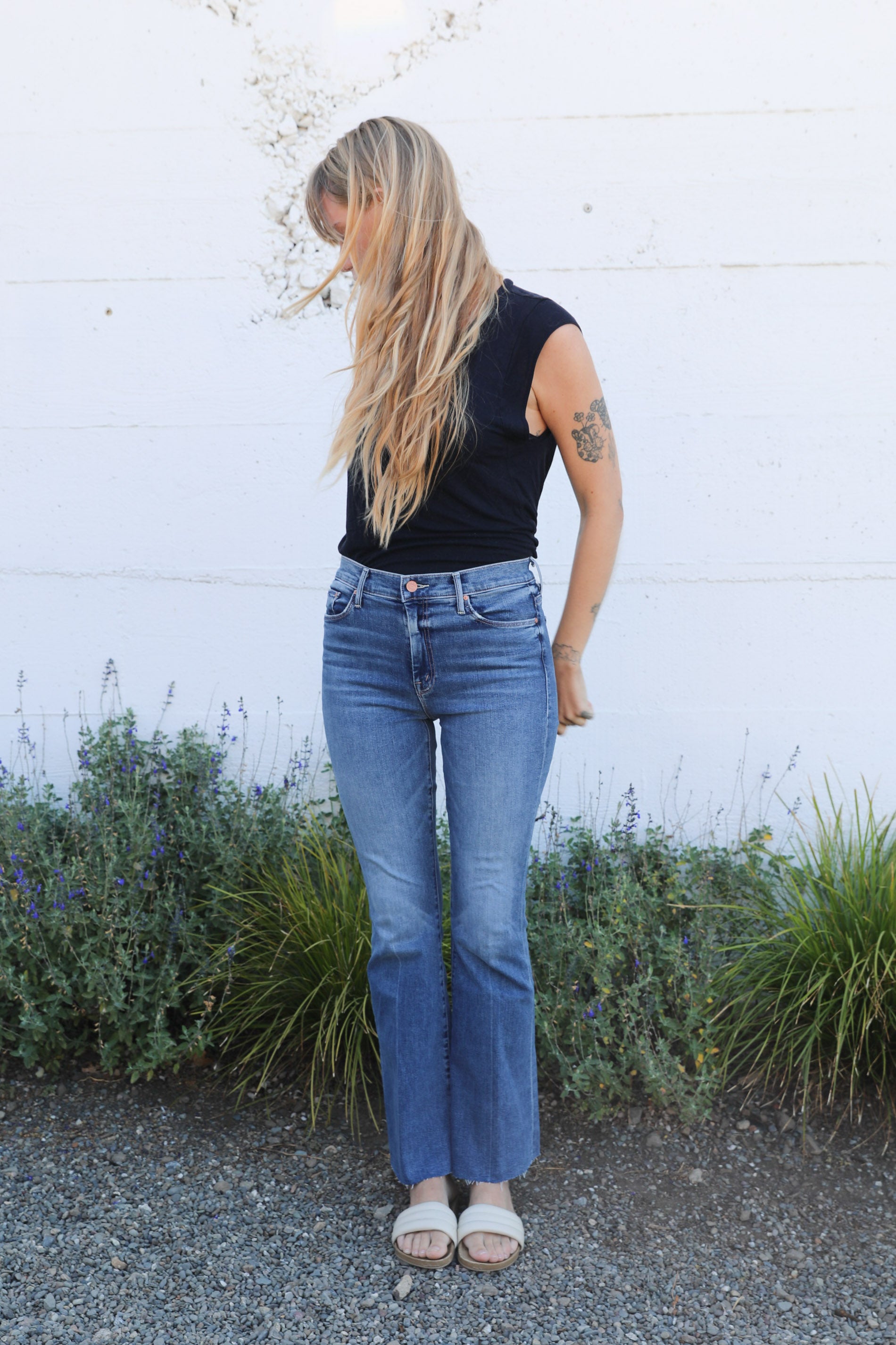Major flare with a mid rise fit and frayed raw hem. Stretch fit denim in a classic blue wash.