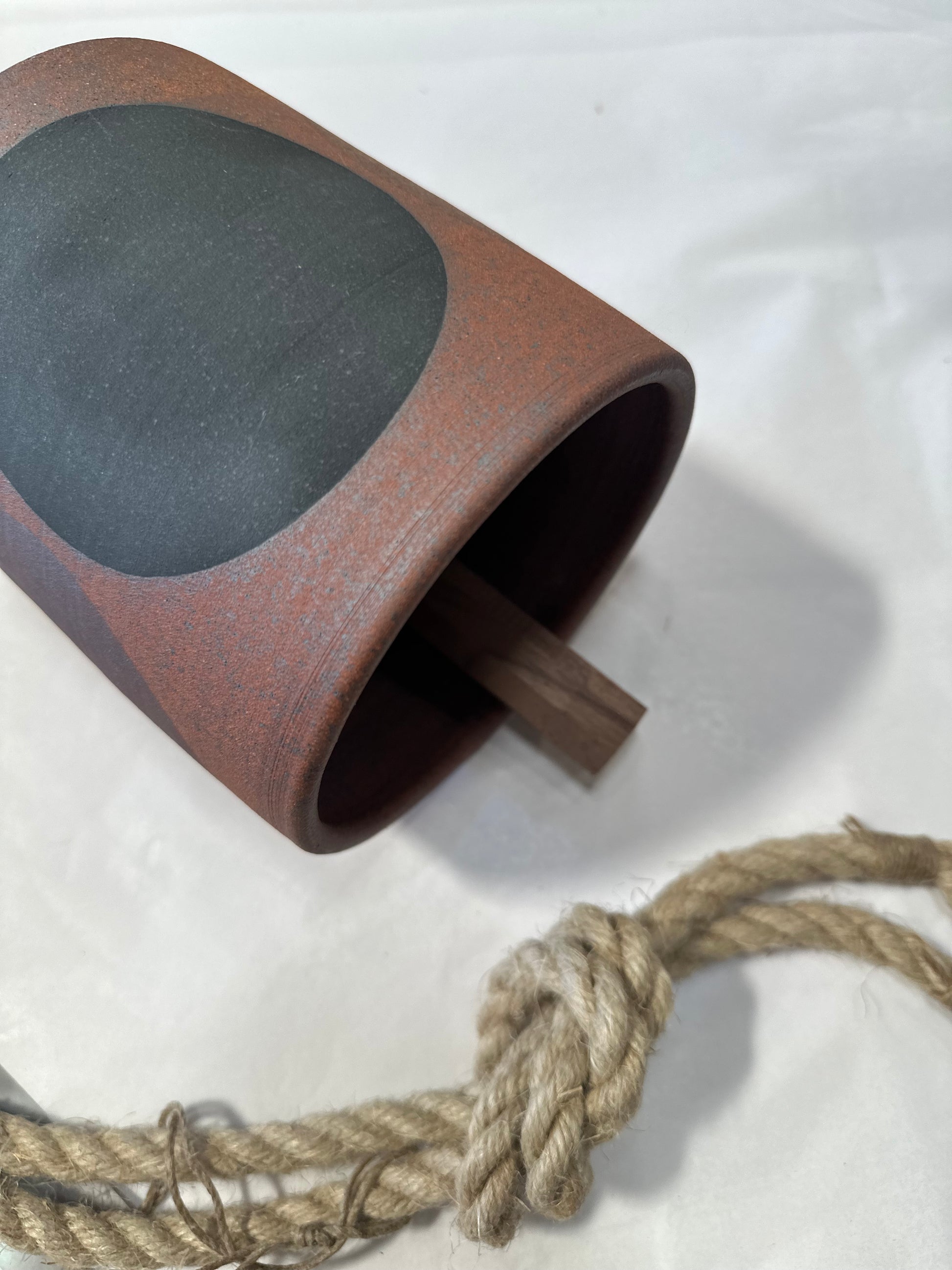 Wide wheel thrown bell in extra dark Tucker stoneware is hand painted with Four Black: Black, Dark Brown, Medium Brown & Golden Brown and a signature glazed crescent
